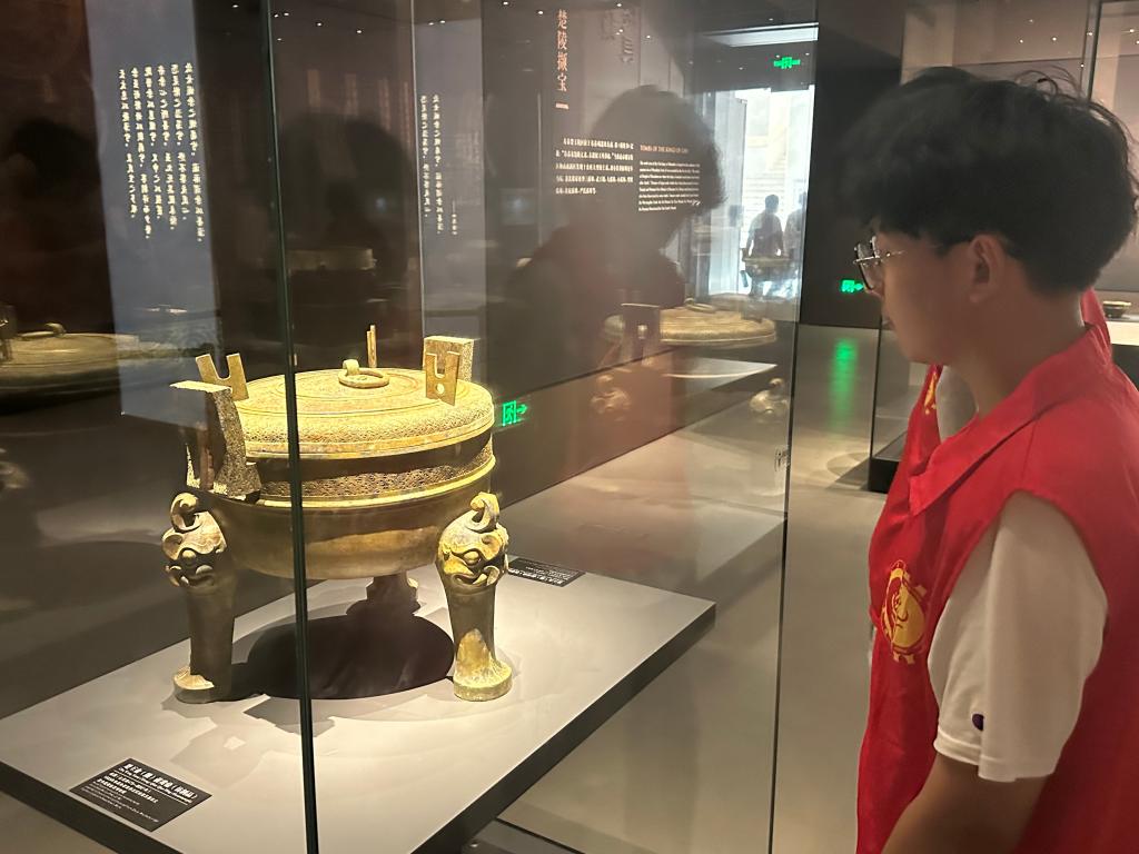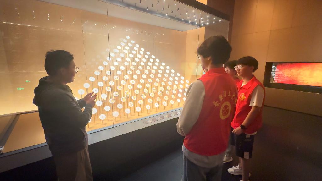 7月3日,实践团队走进安徽楚文化博物馆。指导老师向队员们生动讲解了相关楚文化知识,成员们用手机记录了青铜器纹饰、楚简文字和“郢爰”金币等珍贵文物,形成了“楚文化电子手册”。随后,实践团队参观了淮南市博物馆,详细了解了2024年度“全国十大考古新发现”——武王墩墓的惊世成果。这座迄今规模最大、保存最完整的战国楚国王级大墓,以其震撼的“九室八棺”结构和出土的3000余件珍品,为楚文化的研究树立了新的里程碑。团队成员对武王墩考古成果进行资料梳理,更加深刻认识到楚文化在区域文明演进中的地位与意义,大家纷纷表示深受触动,收获颇丰。