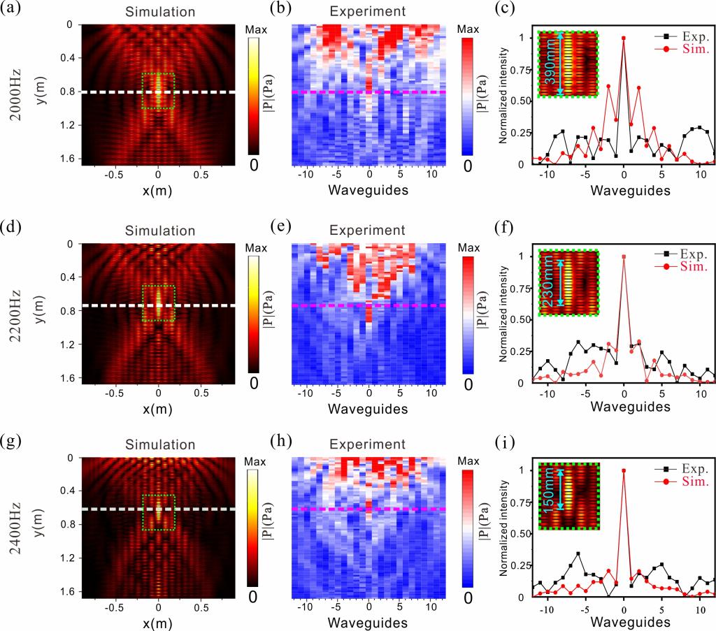 与斯格明子模式的速度场分布操控相比,打破瑞利衍射极限,操控声波压力场传输实现亚波长聚焦有助于实现高分辨率的生物粒子成像。近日,该课题组通过设计人工声学表面波结构产生等效折射率分布呈抛物线型规律的声学波导阵列,实现了声波的深度亚波长聚焦(如图3所示),特别是这种结构产生的聚焦焦斑纵向位置和横向位置还可以通过入射波长与入射方向进行调制,为声学成像和生物粒子探测提供了一种高分辨率成像方法。相关工作发表在Applied Physics Letters122, 222202(2023)上。
