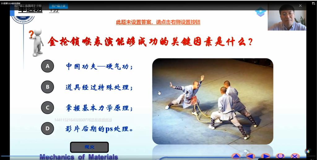 沈晓明老师以《材料力学》课程中的“压杆稳定”章节为例,为观摩老师做了线上教学示范。他对基础力学的深刻理解,采用启发式的教学方式,讲课思路清晰,讲授内容具有很好的逻辑性、实用性和探索性,教学语言具有感染力。他以杂技中的“金枪锁喉”引入课程内容,用动画形象地介绍了稳定平衡、不稳定平衡和临界平衡的概念,结合工程实例和力学家故事介绍力学知识。他在课堂中积极引导学生思考,适时穿插小测验,有效提高了学生参与度。沈老师的线上课堂将理论教学、案例教学、课程互动、课程思政有机融合,与时俱进更新教学内容,凸显了前沿性;在线教学手段呈现先进性和互动性,最大限度的提升了课程实效性。