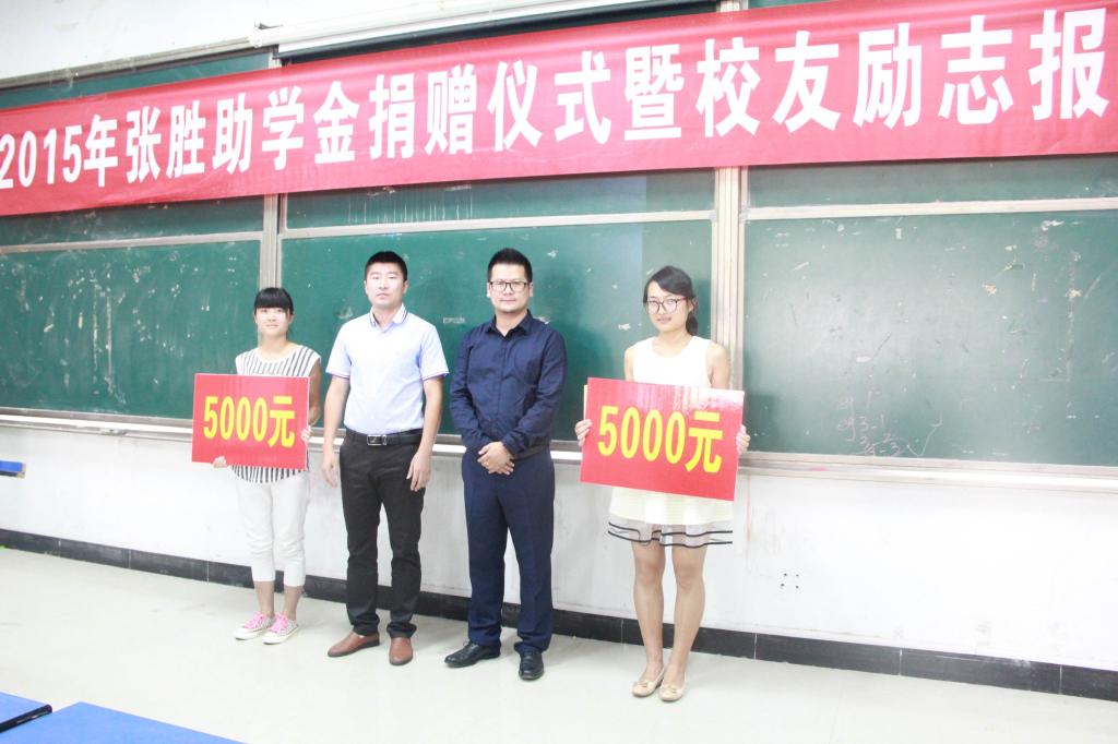 理学院应用统计13-1班林莉同学和应用数学12-2班王楠同学接受了捐赠,校友张胜为她们每人捐助了5000元助学金。据悉,张胜将从2015年开始持续捐助理学院困难学子。张旸代表学院对张胜支持学校发展建设、关爱贫困大学生的高尚善举表示感谢。同时,他对学生提出了三点要求:一是要常怀感恩之心,做传递爱心的使者,用力所能及的行动积极帮助他人;二是要磨练坚忍不拔的意志,弘扬艰苦奋斗的精神;三是要努力学习、奋发成才,不辜负校友、老师们的殷切希望。