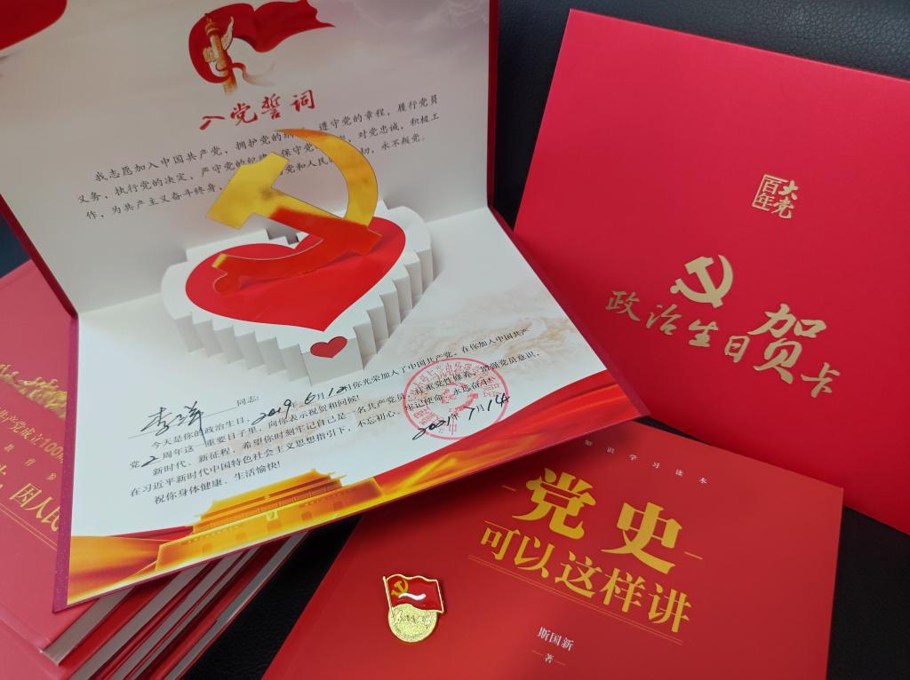 送一张“生日”贺卡。院长经来旺将印着党徽和入党誓词的“政治生日”贺卡送到党员手中。一张张贺卡,是对党员的激励,更是鞭策,提醒党员时刻牢记党员身份,时刻牢记党的宗旨和使命。