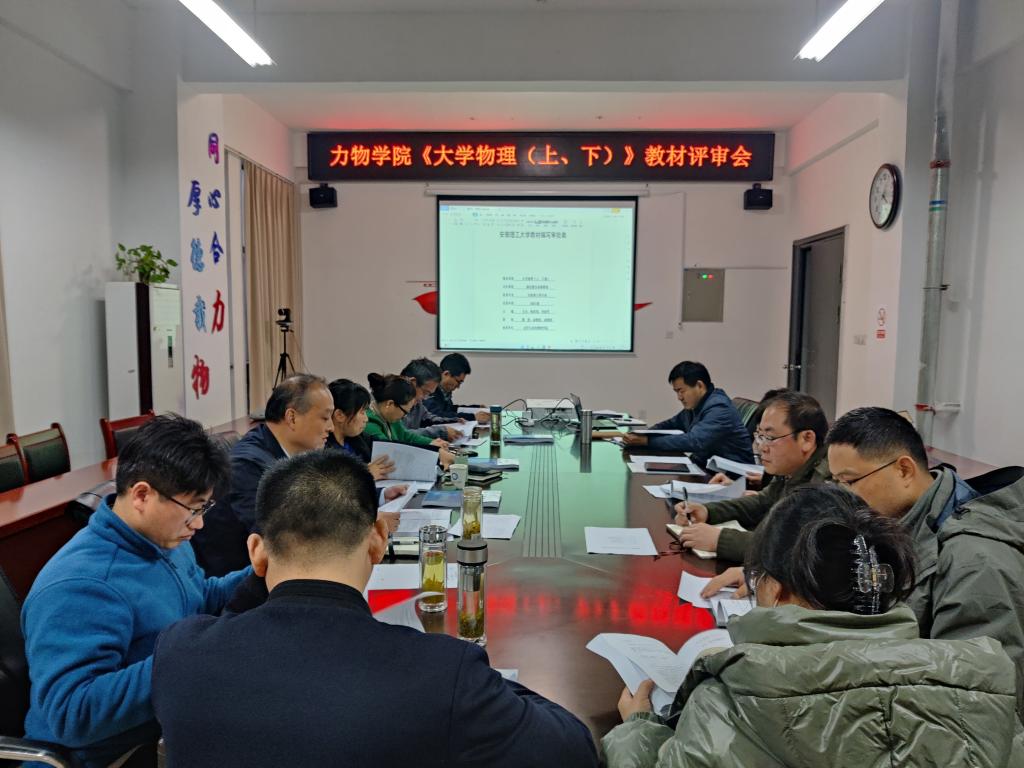 在明道楼A318会议室召开《大学物理(上、下)》教材的评审会,教务处副处长陈庆玲、学院党委书记刘艳、学院教材建设与管理委员会委员、教学督导组成员等老师参加会议,会议由副院长(主持工作)圣宗强主持。