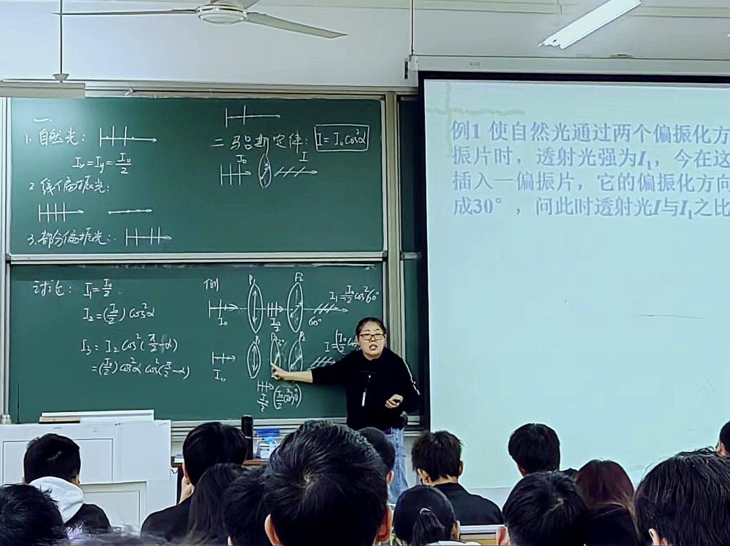 四十五分钟的课上,张彩云介绍了自然光与线偏振光、偏振片的起偏与检偏、马吕斯定律等内容。她表达流利、声音洪亮,教学内容熟练,节奏安排合理,逻辑性强;满满两大块黑板的板书工整清晰,图文并茂,重难点突出;利用多媒体图片和动画辅助教学讲解,深入浅出,结合实际举例生动,将课程思政潜移默化地融入课堂之中。课堂互动气氛活跃,授课教师在轻松愉悦的环境中,巧妙地把枯燥晦涩的物理知识传授给了学生。