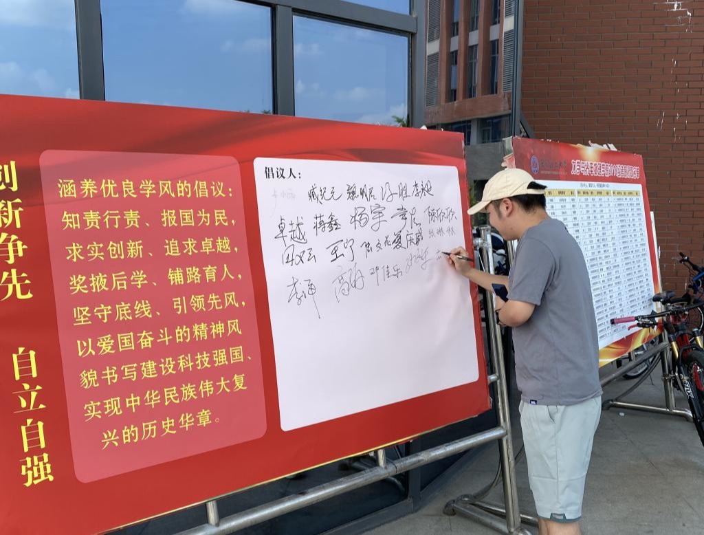 组织师生集体参观科研宣传展报,学习了解钱学森等老一辈科学家的突出事迹,并在“涵养优良学风”的倡议书上庄严签名。