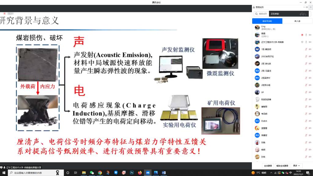 邀请,辽宁工程技术大学肖晓春教授作题为《煤岩破坏的力-声-电演化规律及灾变倾向研究》的学术报告,副院长高娟主持报告会,相关研究领域教师和研究生50余人以线上和线下相结合的方式参加了了会议。