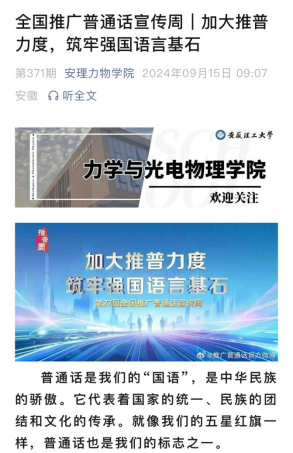 为营造良好的推普环境,学院师生利用主题班会、公众号、展板等多种渠道,广泛宣传国家语言文字法律法规,努力营造和形成人人讲普通话、个个写规范字的良好氛围和行动自觉。