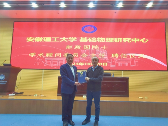 基础物理研究中心学术顾问委员会主任聘任仪式,宫能平代表学校宣读了聘任文件并向赵政国颁发了聘书。