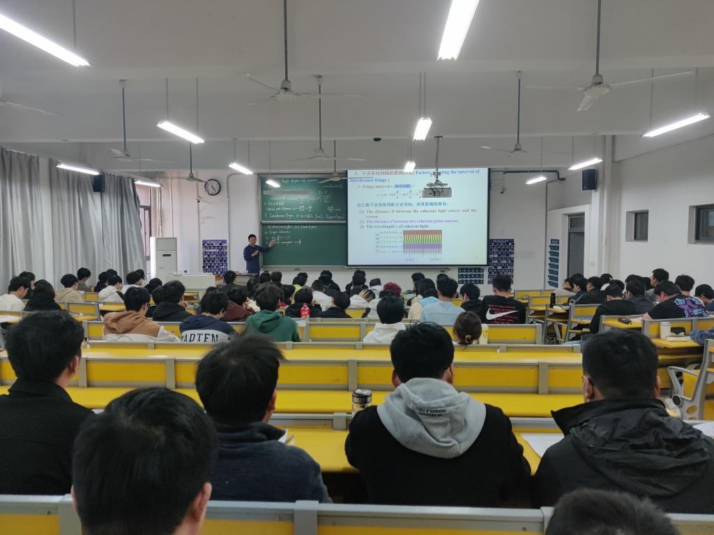本次课程的主要内容为“杨氏双缝干涉实验”。教学过程中,徐老师先通过回顾前面学习的内容对知识点进行梳理,从而循序渐进地引出后面的课程内容。徐老师采用中英文相结合的形式进行授课,学生们积极参与互动,课堂气氛热烈。