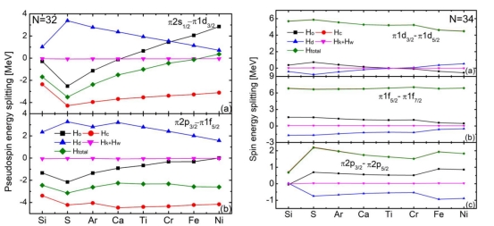 相对论对称性在核结构的演化中扮演着十分重要的角色,如何利用对称性恰当解释奇特结构,是核物理中最重要的研究领域之一。史新星与合作者利用相对论平均场的点耦合模型结合类重整化群方法,以核物理领域关注度极高的中等质量区,新幻数N = 32、34同中子素链偶偶核为例,凭借相对论对称性的研究角度,清晰地展示了奇特核同位旋依赖效应及与相对论平均场的关系,进一步探寻了相对论对称性在壳层演化、气泡结构形成中所起到的重要作用。相关研究成果以《Exploring relativistic symmetry in shell evolution in the N=32 and N=34 isotones within a relativistic point-coupling model and the similarity renormalization group》为题发表:PHYSICAL REVIEWC 111, 034304 (2025)。