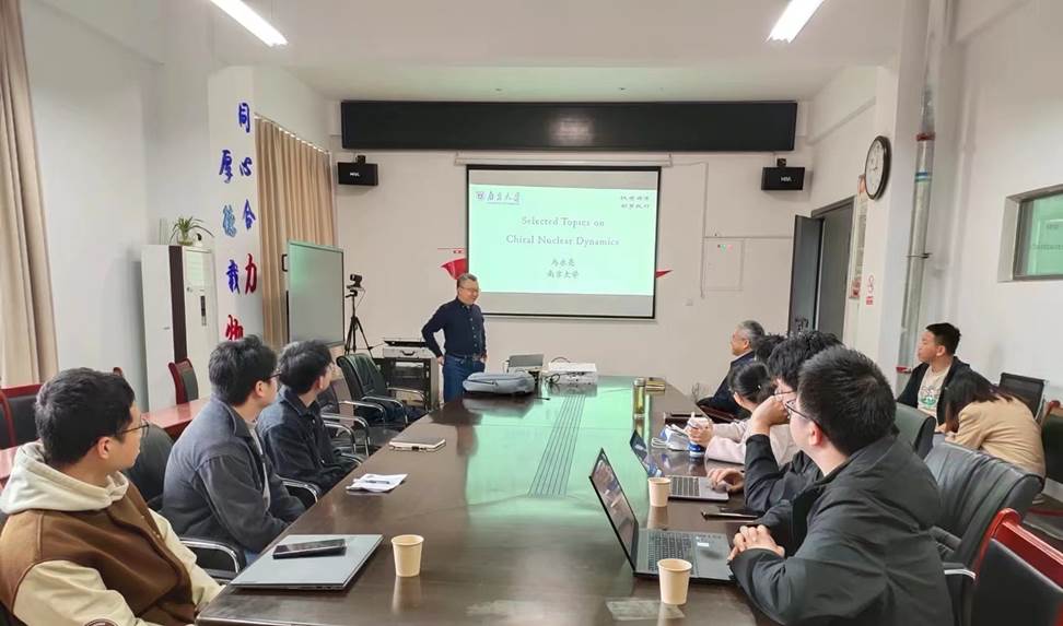 做学术交流,并做题为《手征核子动力学选题》的系列报告,本次学术交流是基础物理研究中心的第一期短期课程,讲授内容基于马永亮教授受邀撰写的图书《Effective Field Theories for Nuclei and Compact-Star Matter: Chiral Nuclear Dynamics》中的部分章节。报告会在院报告厅举行,由学院主要负责人主持,学院领导对马永亮教授的到来表示热烈欢迎,中心成员及学院部分青年教师和研究生参加了报告会。