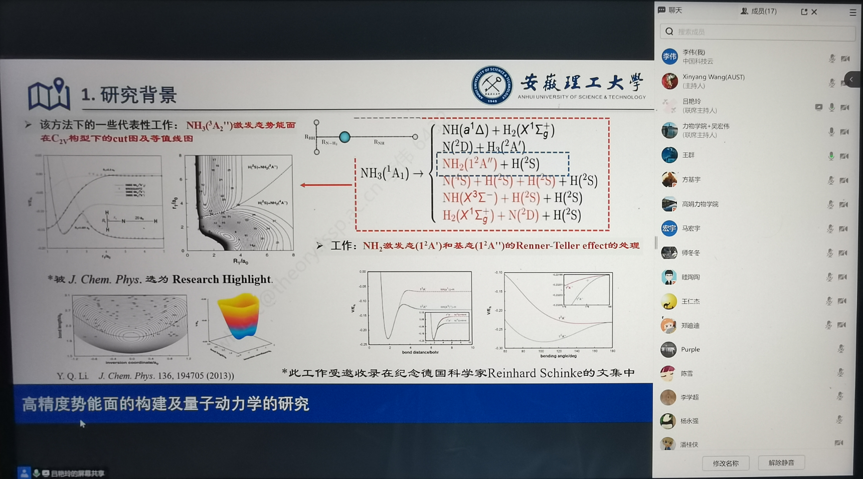 分子势能面是研究分子反应动力学、分子光谱、原子分子碰撞、预测和理解分子特性的基础。对于定性地研究分子反应动力学过程,研究在极端条件下的分子进程、发现新材料起到极其重要的作用。通过给出反应物、中间物和产物的相关信息,呈现出分子的性质和分子反应过程中的特点,因此构建高精度势能面具有重要研究意义。通过构建高精度势能面,给出正确的分子激发态预解离方案,分析分子碰撞反应中激发态能级跃迁简并情况,进一步解释分析分子解离通道的不一致从而导致不收敛的根本原因。最后与参会老师进行了深入探讨交流,并对现场提出的问题做出了详细的解答。