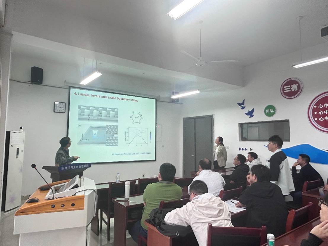 报告会上,刘正猷教授首先从固体物理中的能带概念引入,探讨了普通的固体材料能带与拓扑材料能带的关系与区别。随后,他详细介绍了拓扑声子晶体的表面态、棱边态以及角态的性质与调控。此外,刘教授还展示了基于拓扑声子晶体的新奇应用,如,拓扑声子波导等。除了拓扑声绝缘体外,刘教授也介绍了拓扑半金属的能带结构和性质,阐述了其背景、原理以及设计方法,介绍了半金属的不连续等频线以及产生的抑制反射及负折射现象。