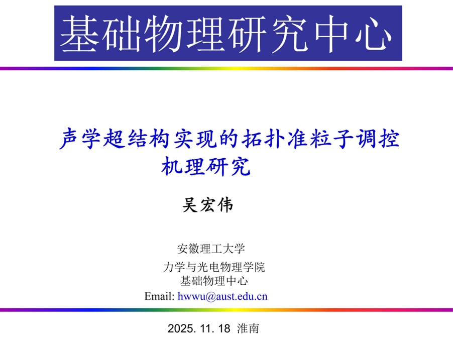 基础物理研究中心吴宏伟教授,就题为“声学超结构实现的声斯格明子模式调控”做了学术报告。报告会由眭陶陶主持,中心成员及学院部分老师参加了报告会。