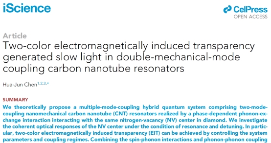 近期,我中心教师陈华俊以唯一作者身份在Cell子刊iScience发表题为《Two-color electromagnetically induced transparency generated slow light in doublemechanical- mode coupling carbon nanotube resonators》的论文,七猫小说